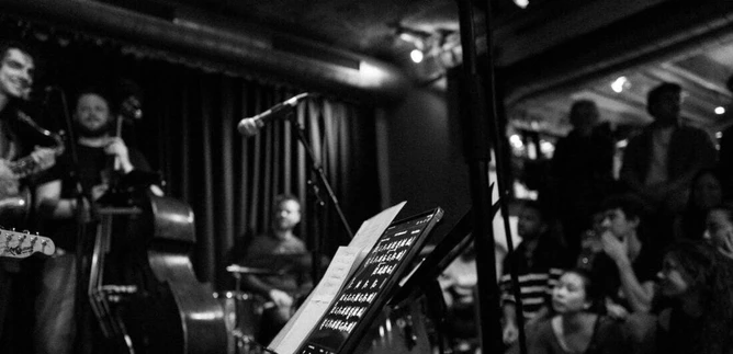 Eine Live-Musikaufführung in einem kleinen, gemütlichen Veranstaltungsort. Die Musiker spielen auf der Bühne, während das Publikum aufmerksam zuschaut. | © Jazzit