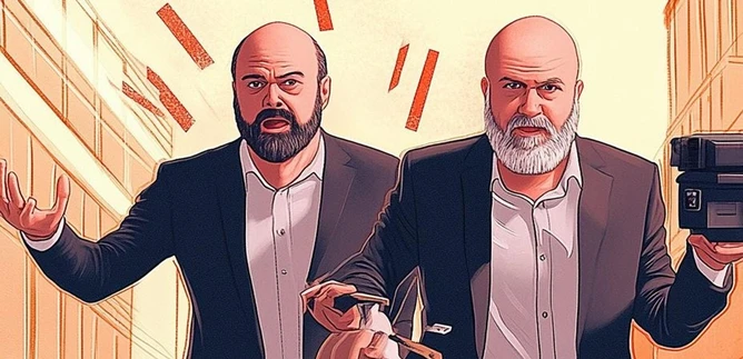 Ein schwarz-weißes Bild mit zwei Männern, die in einem Comic-Stil dargestellt sind. Über ihnen schwebt die Sprechblase "Das war 2025" und im Vordergrund sind Puppen mit Fäden zu sehen. | © ORF / Roman Zach-Kiesling