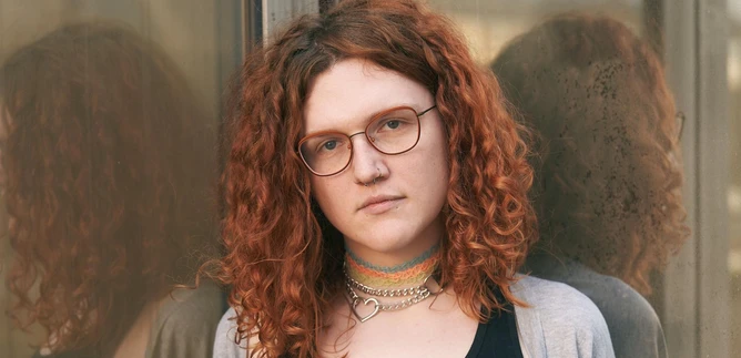 Ein Mann mit lockigem Haar hält ein Glas vor sein Auge. Der Hintergrund ist orange, was das Bild lebhaft wirken lässt. | © Anna Sophie Kölbl