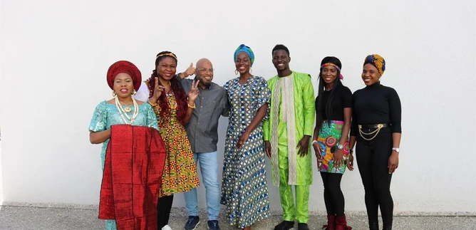 Zwei Musiker stehen vor einem kreativen Hintergrund mit Musikinstrumenten wie einer Gitarre und einem Keyboard. Der Hintergrund ist bunt und künstlerisch gestaltet. | © joasihno.de