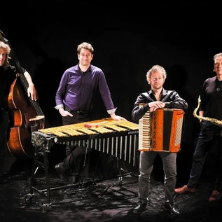 Eine Musikgruppe spielt in einem eleganten Raum. Vier Musiker mit verschiedenen Instrumenten stehen zusammen, während ein Pianist am Klavier sitzt. | © Ehrbarsaal