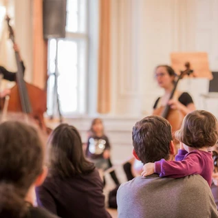 Ein Konzertsaal mit vielen Zuschauern, die einem Ensemble aus vier Musikern zuhören. Die Dekoration ist prächtig, mit goldenen Statuen und einem festlichen Ambiente.
