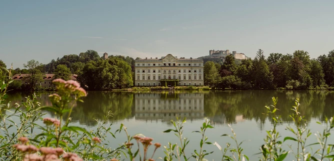 An elegant castle reflects in the calm lake. Surrounded by lush greenery and colorful flowers. | © TSG Tourismus Salzburg GmbH, Patrick Langwallner