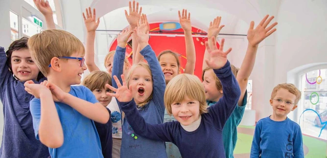 A group of cheerful children stands in a colorful room, raising their hands. They are all wearing blue clothing and radiating joy. | © Eva trifft_Fotografie