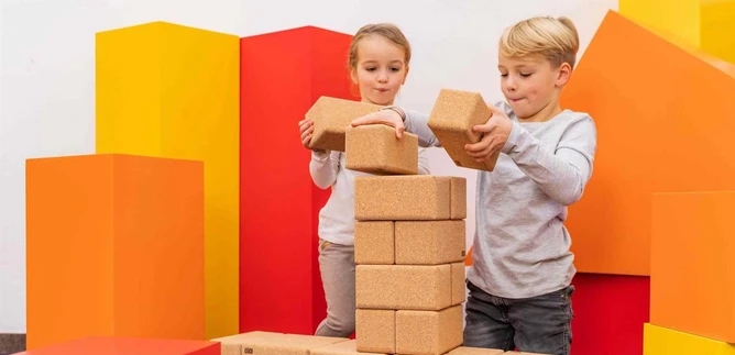 Two children are building a structure with wooden blocks. Colorful geometric shapes are visible in the background. | © Salzburg Museum