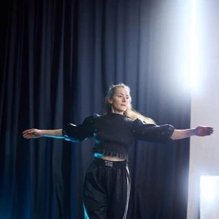 A woman in an elegant outfit stands in the middle, while several people in the background hang on pipes. The scene feels dramatic and modern. | © SLT / Tobias Witzgall